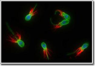 Choanoflagellate là những tế bào vi khuẩn có nhân hoàn chỉnh ở dưới nước đặc trưng với cái roi ở trên đầu (màu xanh lá) dùng để bơi và ăn; xung quanh là một nhóm các tua cảm (màu đỏ) để bắt con mồi. Nhân của chúng có màu xanh lục. (Ảnh: Phòng thí nghiệm Nicole King, UC Berkeley) |