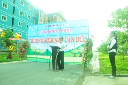 Ngày 4/6 vừa qua trường Mầm Non Tân Đức chính thức đi vào hoạt động tại địa chỉ 24A, Khu dân cư Tân Đức, Đức Hòa, Long An. Trường có 2 lớp Nhà trẻ và 2 lớp Mẫu giáo, học sinh là các cháu thuộc con em công nhân trong Khu công nghiệp Tân Đức, giảng viên, cán bộ công nhân viên làm việc tại Tập đoàn Tân Tạo và Đại học Tân Tạo.