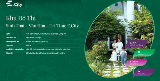 Dự án Khu đô thị E.City Tân Đức là một trong những dự án trọng điểm của ITACO, được định hướng phát triển trở thành một khu đô thị thông minh, hiện đại, đáp ứng các tiêu chuẩn về môi trường sống, giáo dục, y tế và hạ tầng kỹ thuật bền vững.